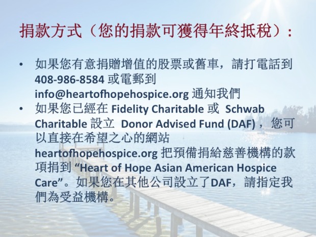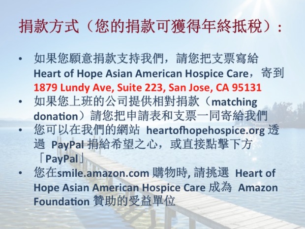 由於州政府的程序延誤,我們比預定開啟的時間晚了6個月。這半年裡,我們使用去年募得的50萬啟動基金,一方面繼續提供各樣免費的社區服務,一方面聘任與培訓新進工作人員,包含兩位兼職安寧醫師,7位雙語護理師,兩位雙語醫療社工,三位雙語院牧,三位雙語護 佐,以及行政主管與助理等。我們目前已經開始提供專業安寧療護,並且準備聯邦醫療保險中心CMS(Center for Medicare & Medicaid Services )的醫療服務給付請領資格認證審查。聯邦政府將對我們進行不預先通知的突擊檢查,並且規定機構必須至少已經看過五位病 人,檢查當日至少有三位正在接受服務的病人。沒有人能預測這項為期三天突擊檢查的時間,可能在今年底,在明年初,也可能在半年後。我們必須通過這項聯邦醫療中心為期三天的不預告突擊檢查,之後CMS還需要三個月的作業時間,我們才能獲準開始請領聯邦醫療服務給付。目前,我們所有照看病人的一切醫療與醫護人事費用,完全無法獲得給付而由希望之心自行負擔。同時,2022年起,通貨膨漲的嚴重程度,令人始料未及。因此,我們把希望之心的現況,發展與需要再度與您分享,希望能繼續獲得您的鼓勵與支持。今後,我們將繼續秉持那起初的愛與承諾,堅持提供高品質的病人照顧,與關愛支持家人為宗旨的非營利專業生命末期醫護關懷服務,將您無私的每一分愛心奉獻,都轉化成對華亞裔社區的誠摯祝福。