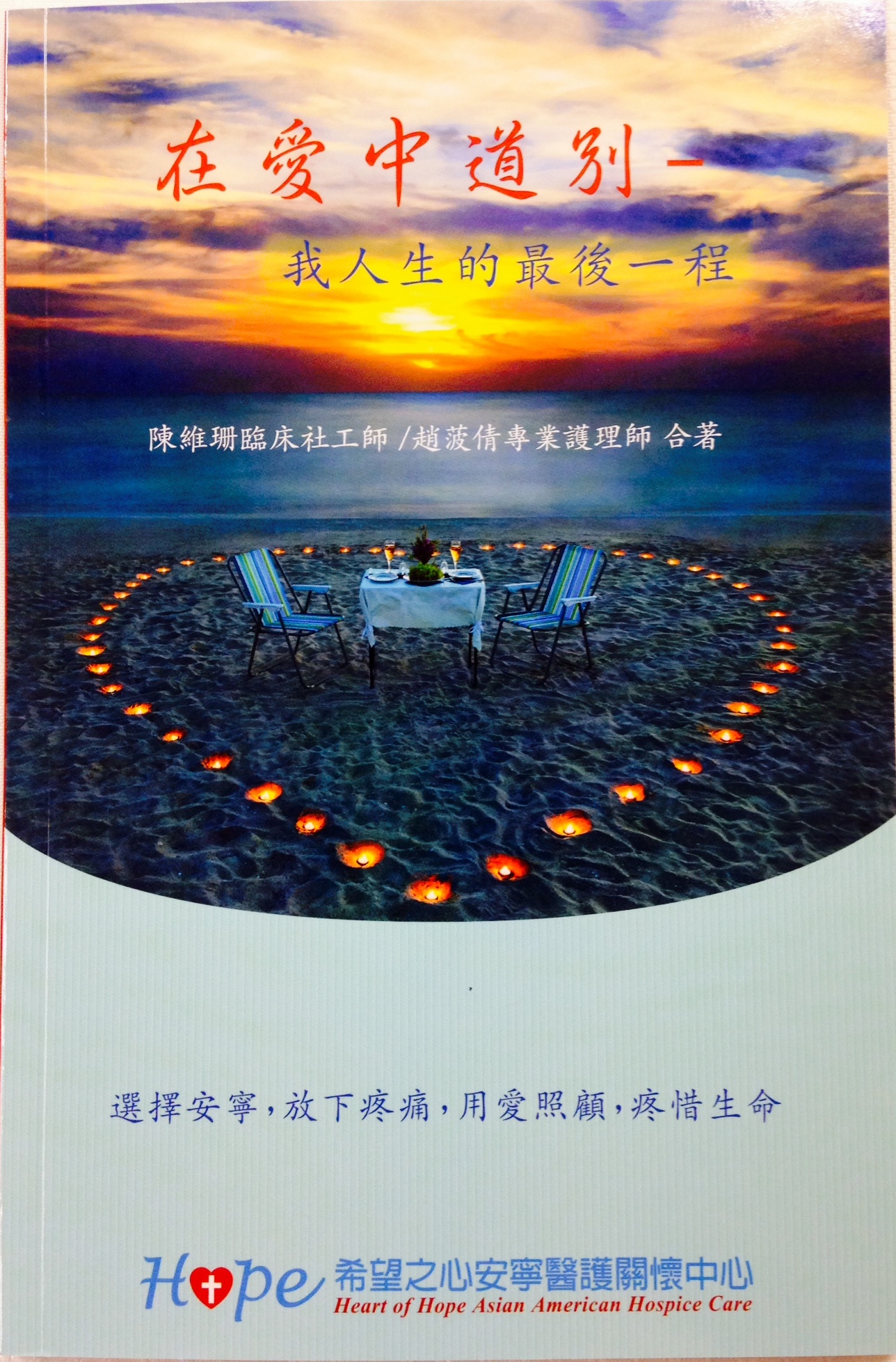 由「希望之心安寧醫護關懷中心」共同創辦人陳維珊執照臨床社工師和顧問趙菠倩資深專業護理師共同撰寫的『在愛中道別 –我人生的最後一程』這一本中英文對照敘述生命末期病人最後6個月身心狀態的手冊已經發行了。這本手冊以末期病人第一人稱的方式陳述,讓陪伴者和探望者了解病人可能出現的身體症狀、意識狀態、心情寫照和最後的期許 – 受尊重、有尊嚴、安詳地與親人在愛中道別。
